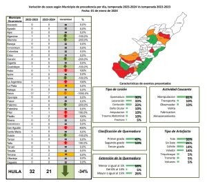 La Secretaría de Salud Departamental del Huila realiza acompañamiento a las Direcciones Locales de Salud para la respectiva atención de los casos notificados, y recuerda que la temporada de vigilancia intensificada de lesiones por pólvora pirotécnica e intoxicaciones por consumo de fósforo blanco se extenderá hasta el 14 de enero de 2024.